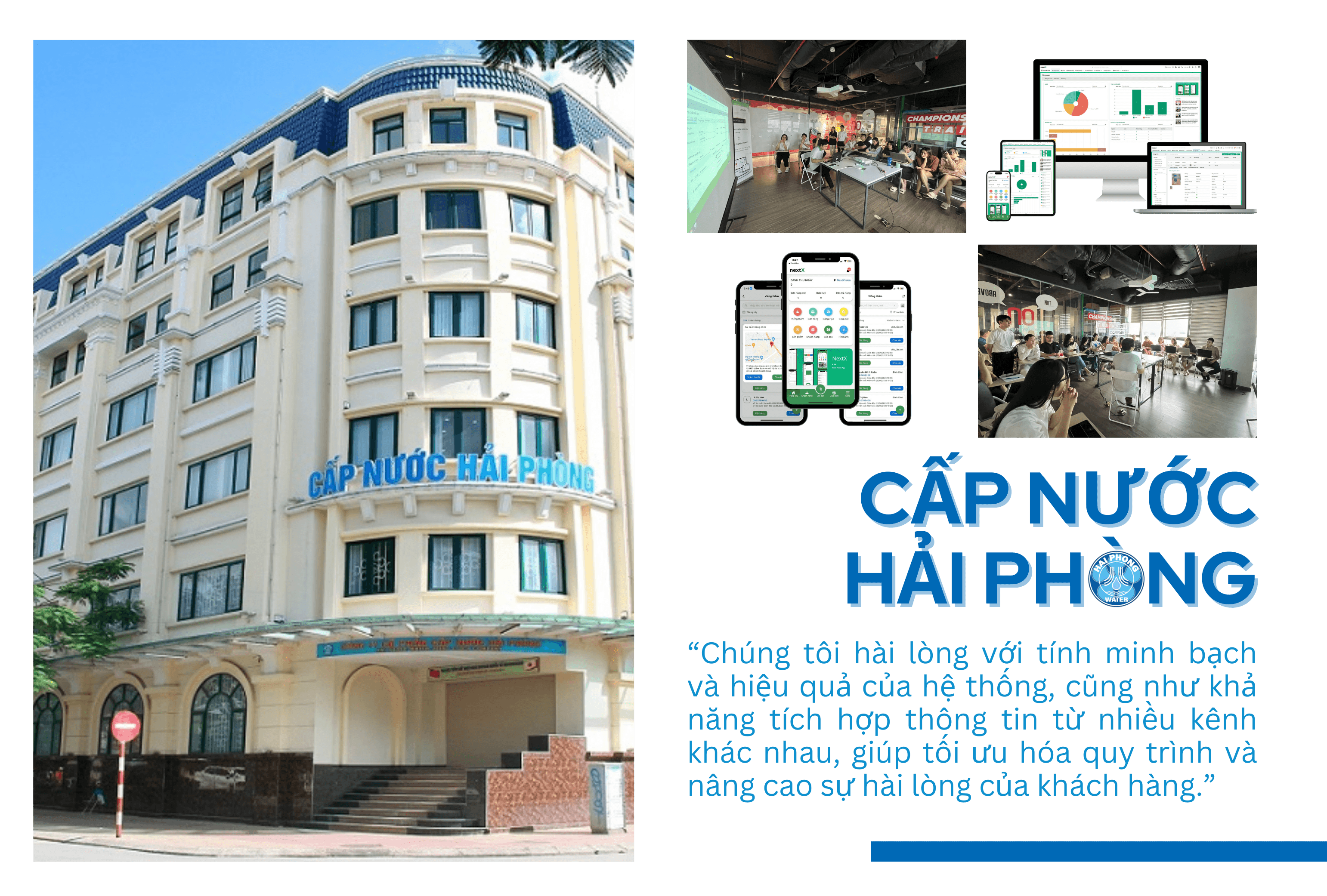 Sau khi triển khai hệ thống CRM của NextX, Cấp nước Hải Phòng cho biết “đây là bước tiến quan trọng giúp cấp nước Hải Phòng cải thiện quản lý và chăm sóc khách hàng đáng kể. Chúng tôi hài lòng với tính minh bạch và hiệu quả của hệ thống, cũng như khả năng tích hợp thông tin từ nhiều kênh khác nhau, giúp tối ưu hóa quy trình và nâng cao sự hài lòng của khách hàng.”
