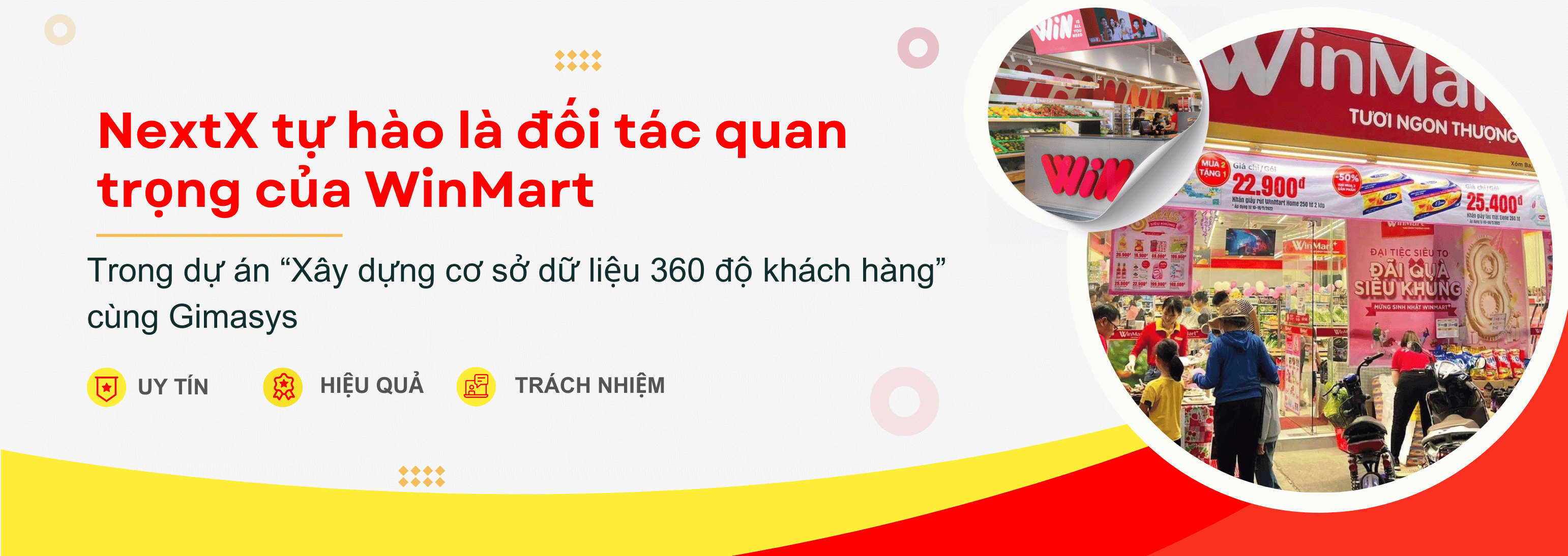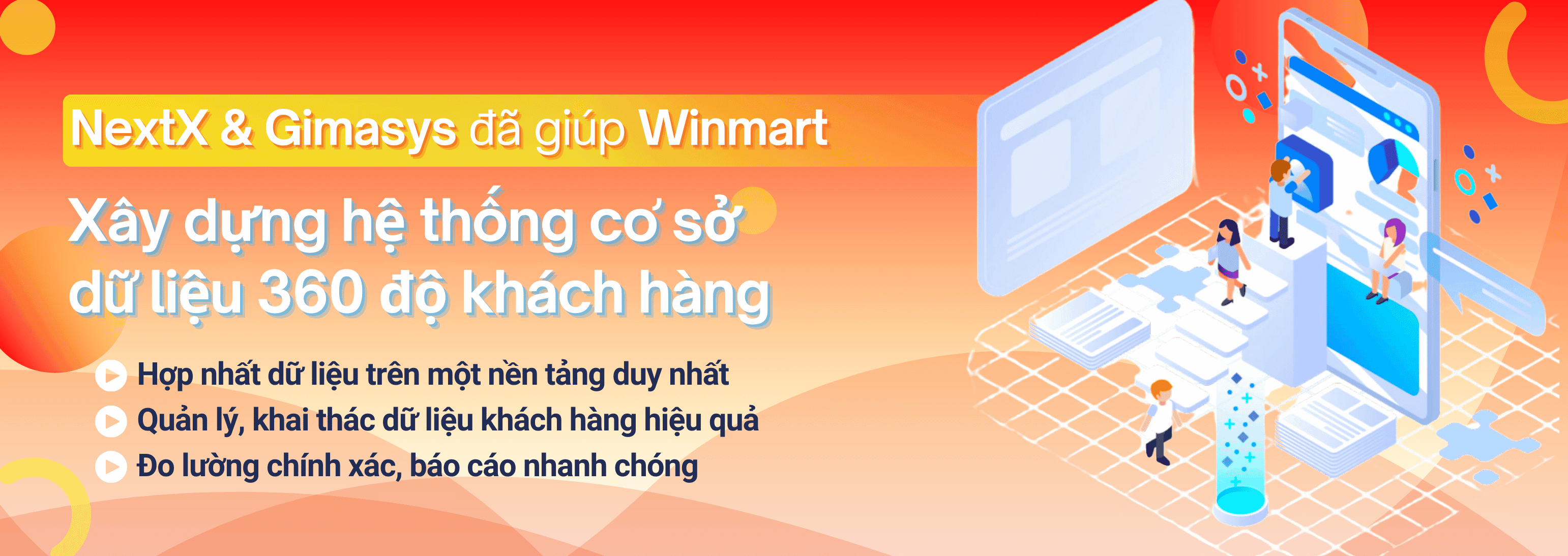 NextX tự hào là đối tác quan trọng trong dự án "Xây dựng hệ thống cơ sở dữ liệu 360 độ khách hàng" cho Winmart, một dự án trọng điểm có ý nghĩa đặc biệt trong việc nâng cao trải nghiệm khách hàng và hiện thực hóa tầm nhìn dài hạn của Winmart. Được triển khai với sự phối hợp của Gimasys, dự án này hứa hẹn mang lại nhiều bước đột phá cho hệ thống bán lẻ hàng đầu Việt Nam.
