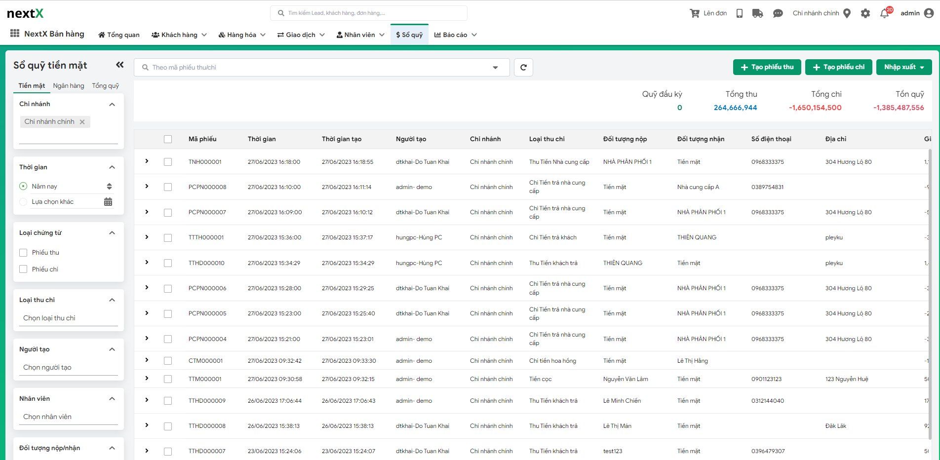 • Quản lý sổ quỹ: Phiếu thu và phiếu chi (Tiền mặt, ngân hàng, và tổng quỹ)