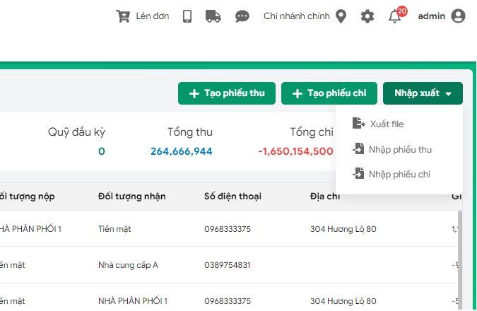 • Nhập xuất excel Sổ Quỹ