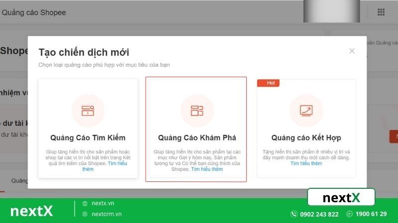 - Bước 1: Lựa chọn hình thức “Quảng cáo khám phá”